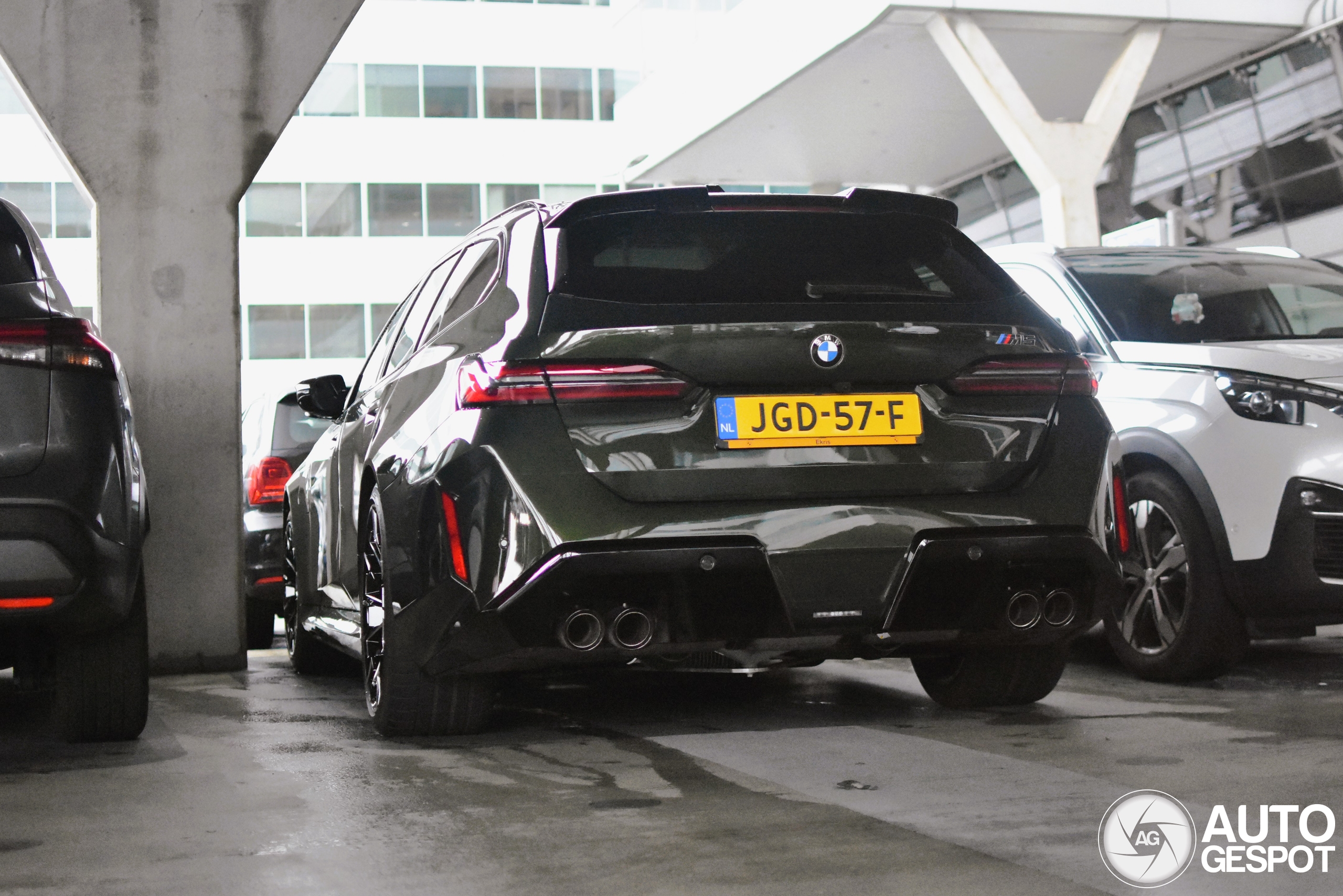 Heerlijke M5 Touring! De groene kleur is onder de overkapping helaas niet goed zichtbaar. Ook deze stond behoorlijk krap op de auto voor 'm.